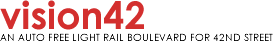 vision42 is a citizens' initiative to re-imagine and upgrade surface transit in Midtown Manhattan, with a low-floor light rail line running river-to-river along 42nd Street within a landscaped pedestrian boulevard. vision42 could be a prototype for a whole network of landscaped, pedestrian/light rail streets throughout the city. It is sponsored by the Institute for Rational Urban Mobility, a New York-based not-for-profit corporation.